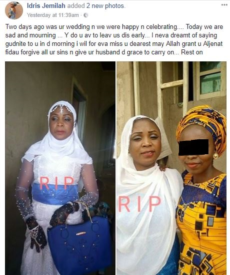 Jemilah wrote: "Two days ago was your wedding and we were happy and celebrating.... Today we are sad and mourning ... Why do you have to leave us this early... I never dreamt of saying goodnight to you in the morning I will for ever miss you dearest. May Allah grant you Aljenat fidau. Forgive all your sins and give your husband the grace to carry on... Rest on."